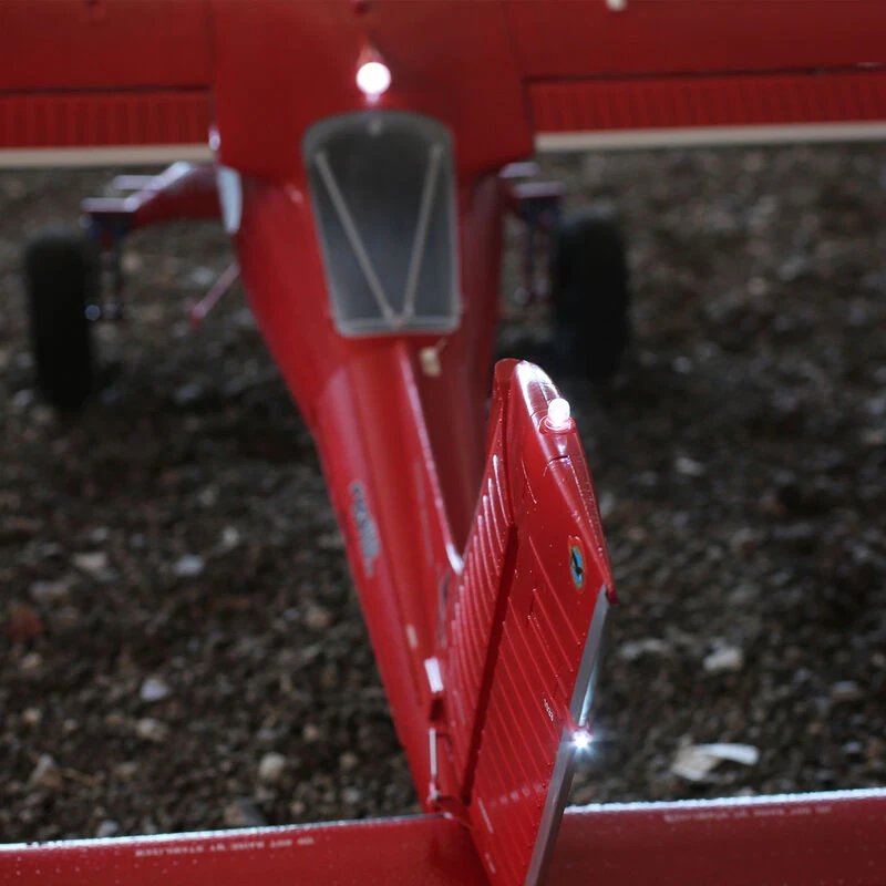 There are a total of 17 LEDs throughout the airframe to simulate navigation, landing, down, tail beacon, reversing and other lights. They’re connected to a custom light controller with different settings you can control from the transmitter to choose which lights turn on and off with various functions, glow solid, strobe and more.