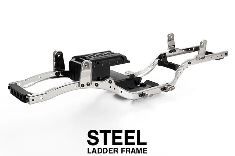 The GS01 ladder frame is designed to look like the chassis of a real car and is made of high strength steel. The C-channel side rail offers added stability and is bolted with cross members to aid against twisting or warping. The steel parts are also nickel plated for a glossy look and are resistant to corrosion.