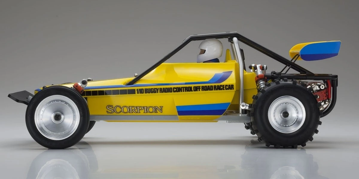 The legendary Kyosho Scorpion is credited with taking the racing buggy category into the realm of pure motorsports. Even after 30 years since it was first released in 1982, the indelible mark of the Scorpion still exists with its many fans around the world. Kyosho is proud to renew this machine to all its former glory! While maintaining the wild and free spirit of the original baja buggy style and chassis layout, the 2014 version features the latest in performance technology and sacrifices nothing in speed and endurance on modern buggy racing tracks. Externally it may look like the original Scorpion with its semi-trailing suspension arms, but the advanced 6061T6 forged aluminum material delivers futuristic levels of strength, rigidity and durability. Following the original design, the Scorpion 2014 features a new two-piece die-cast aluminum gearbox with differential gears. In addition, the included slipper clutch protects the transmission as well as delivers efficient traction that takes the Scorpion s control feel and durability to a new higher level. Precision 48 pitch gears reduce traction pulsation for direct driving control characteristics while the flat under surface of the countersunk chassis has no protruding screw heads for minimal contact resistance and scraping, resulting in higher durability. Stainless shafts combine with aluminum cylinders in the oil shocks for smooth stroke from top to bottom and running performance worthy of a true racing buggy. Like the original Scorpion, the 2014 version is packaged as an unassembled kit, but nearly all tapping screws and nuts have been replaced with the improved lightweight and security a hex screws. From expert racers who knew the magic of the original Scorpion to modern-day racers, discover for yourself why the Scorpion 2014 commands such respect!
