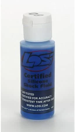 4oz bottle of Team Losi Racing 60wt silicone shock oil used with oil filled shocks. Losi shock oil is made from 100% pure silicone oil and will not thin out in hot weather or thicken up in cold weather. The higher the weight number of the oil, the thicker the oil is. Losi shock oil is generally slightly thicker than Team Associated shock oil with the same ‘weight’ rating.
