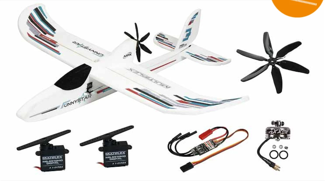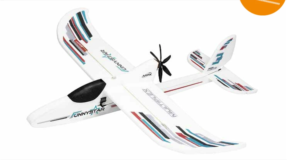 The Multiplex Funnystar is the perfect introduction to the world of model flying. It is suitable for both outdoor use and indoor use (gymnasiums and sports halls). By using crash-resistant material (EPP), the Funnystar can put up with a lot. Beginners and experienced fliers alike will appreciate this model. The construction of the model is kept as simple as possible and can therefore be mastered well by beginners. The flight characteristics are very uncomplicated, the model flies seamlessly and has positive responses to control functions. A special feature of the Funnystar is its wing, which can be removed without tools, this feature enables easy transport and space-saving storage. The model is a lot of fun for beginners and experienced fliers alike.