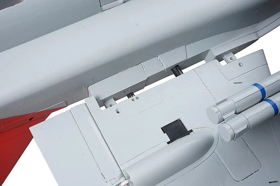 With a 6S Lipo battery, the high-pow- er 80mm EDF with 12-blade fan, 6S-compatible brush- less inrunner motor and 100A ESC deliver fan- tastic top speed and vertical performance plus amazing turbine-like sound. With stability it’s a scale jet that flies smooth and handles like a sport jet. Integrated wing connectors and glueless design facilitate fast and easy assembly, so you can get the 80mm T-7A airborne in less than one hour.